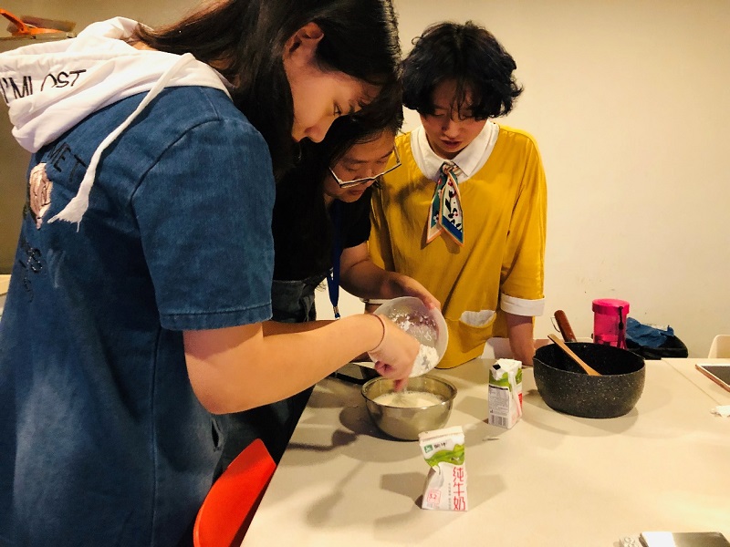 同学们一起合作纯牛奶里加入玉米淀粉、白砂糖等材料,充分搅拌。