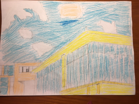 这幅画作叫《图书馆》。我画的图书馆的一角和天空,我的画工不太好,哈哈哈哈。但是我真的好想念学校的图书馆,有超快的网络,超多的学习资源,最主要的氛围好!!!! 我现在在家,连个FYP的资料都查不到,太悲惨了,5555,求你快点开学!!!(参赛者:苏云鹤)