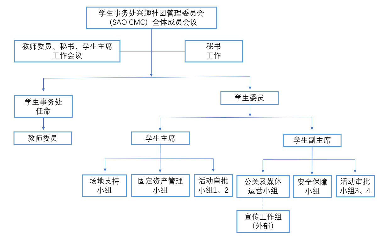 学生事务处-兴趣社团管理委员会(SAO-ICMC)由学生事务处办公室指定相关的教职员以及学生兴趣社团代表联合成立。委员会成员共18人,其中学生兴趣社团代表14人。委员会组成结构如下图: